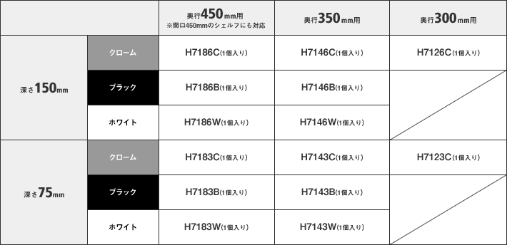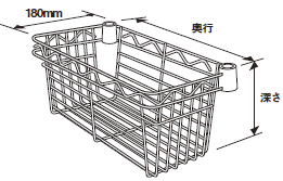 ボトルや、不定形の物などの収納に便利なバスケット。シェルフの奥行き方向、内側・外側どちらにも取り付けられ、収納効率や使い勝手が向上します。深さ75mmと150mmの2種類があります。
