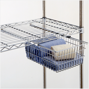 ワイヤーシェルフ下側の奥行側に、ハンギングレールを取り付ければ、シェルフイン・シェルフ用のスライドバスケットを吊り下げて使用できます。