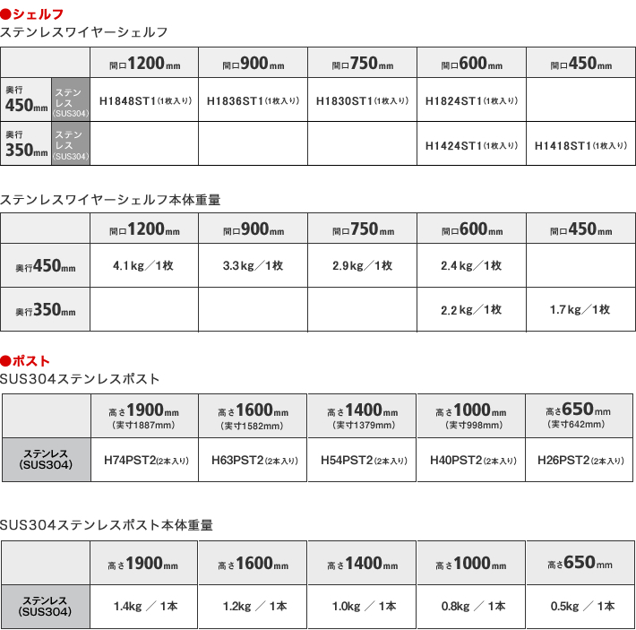 ※耐食性等を考え、ステンレスシリーズはシェルフ・ポスト共に同じシリーズでご使用ください。
