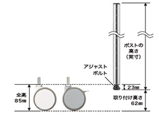 例)高さ700mmのポストにエラストマーキャスターを取り付けた場合: