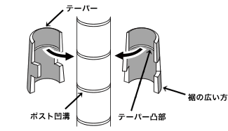 テーパードスリーブは、裾の広い方を下向きにして、棚の取り付け位置に、テーパーの内側の凸部とポストの凹溝が合うように、1個ずつカチッとセットします。