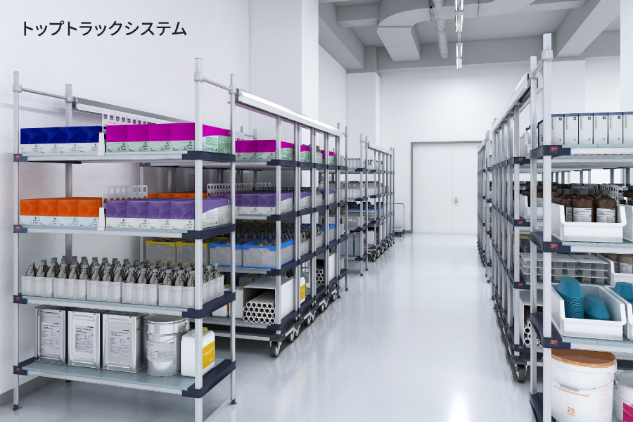 耐荷重を重視した、専門性の高い現場(ホテルやレストランのバックヤード、病院の手術備品、研究施設の薬品保管など)に最適な移動棚。レールが上部にあるので、棚と棚の間でカートを使用でき、ピッキング作業もラクに行えます。