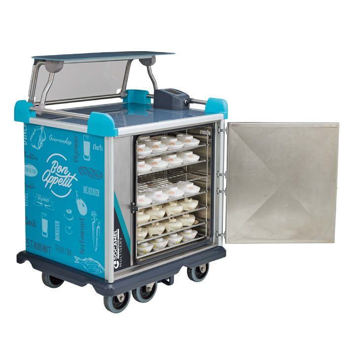 クックチル・ニュークックチルによる業務の効率化と、対面盛り付けによりサービス向上の両立が図れます。食堂やデイルームで盛り付けしながら食事提提供する施設様に最適です。マルチサーブ ジュニアのワゴン内はチルド冷蔵+再加熱庫となっています。