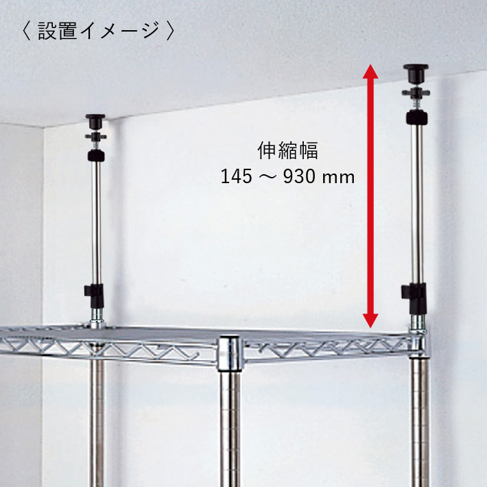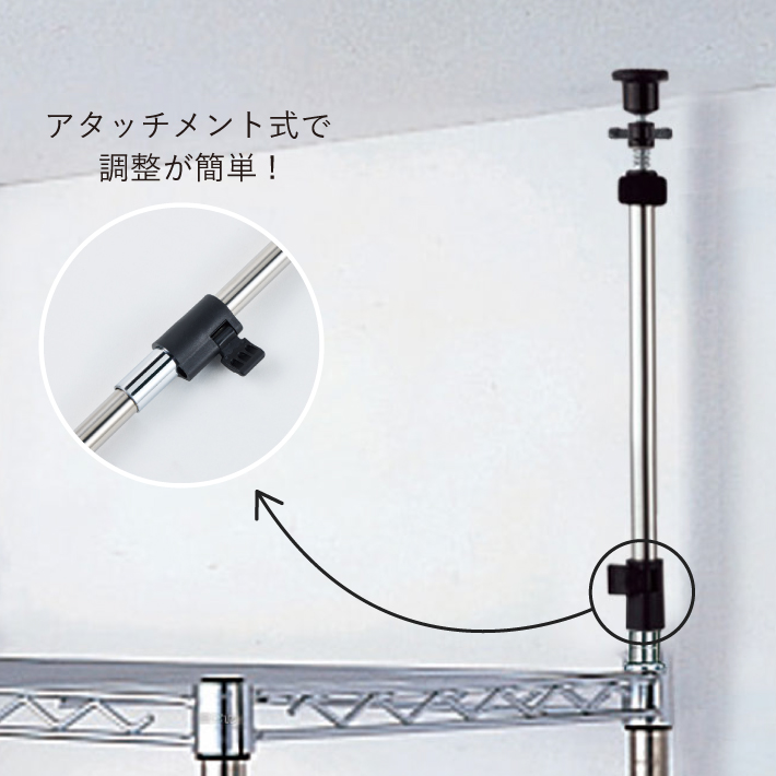 突っ張り式の転倒防止パーツ。ポール上部のキャップをはずし、セーフティポールを差し込んで設置します。ポール先端から天井まで145~930mmの範囲で取り付け可能です。 2026年に仕様をリニューアル。調整方式がダイヤル式からアタッチメント式に変わり、長さの調整がより簡単になりました。 旧商品(BSFP)の製品情報はこちら