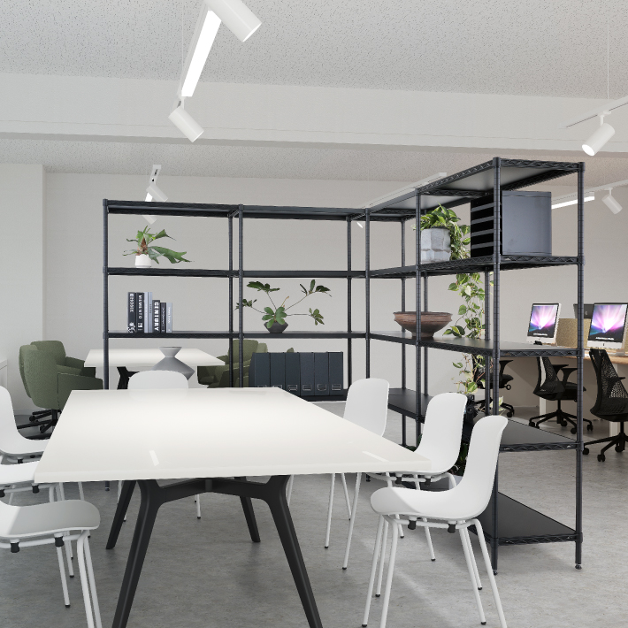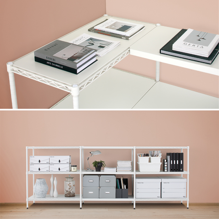 天板を被せるだけで左右・前後に自由に連結できるので、ポールが重ならないコーナー設置や柱回りのディスプレイ、壁面収納やワードローブ連携など、シーン別の使いこなしが広がります。