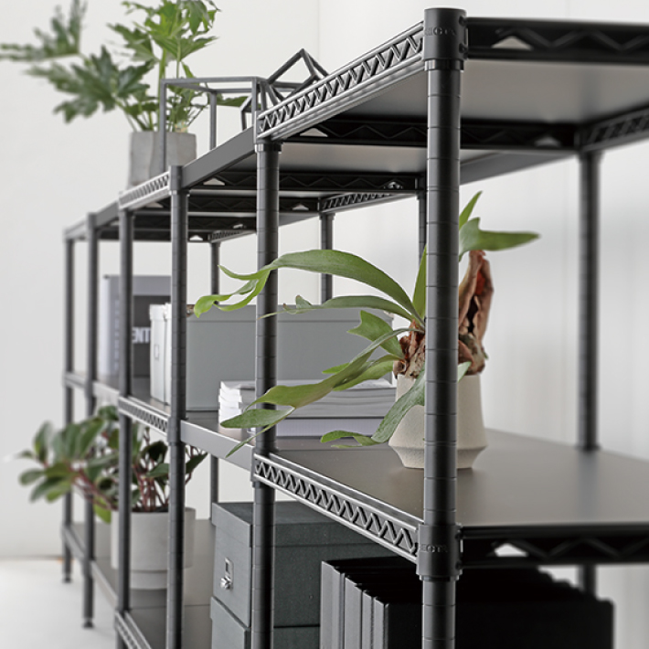 フラットシェルフ同士は、外側線材に天板をはめ込むだけで連結可能。工具は不要で、組み立てやレイアウト変更も簡単。