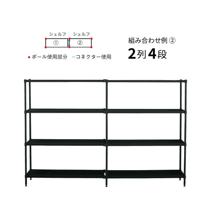 ● フラットシェルフの連結にはフレーム外側の線材を使うため、奥行・間口いずれの方向でも組み合わせができます。