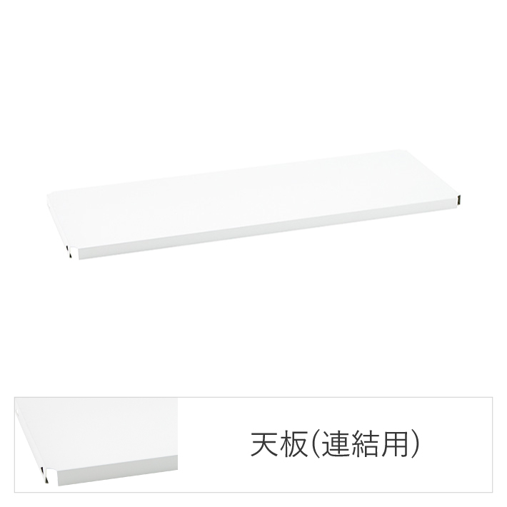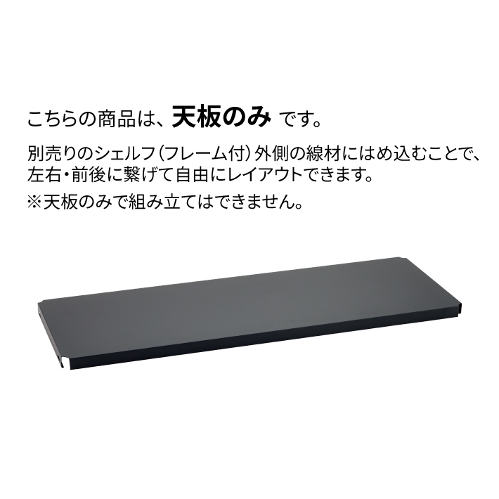 フラットシェルフとフラットシェルフの間に天板をはめ込むだけで、左右・前後に自由に連結可能。連結用天板のため、フレームは付属していません。