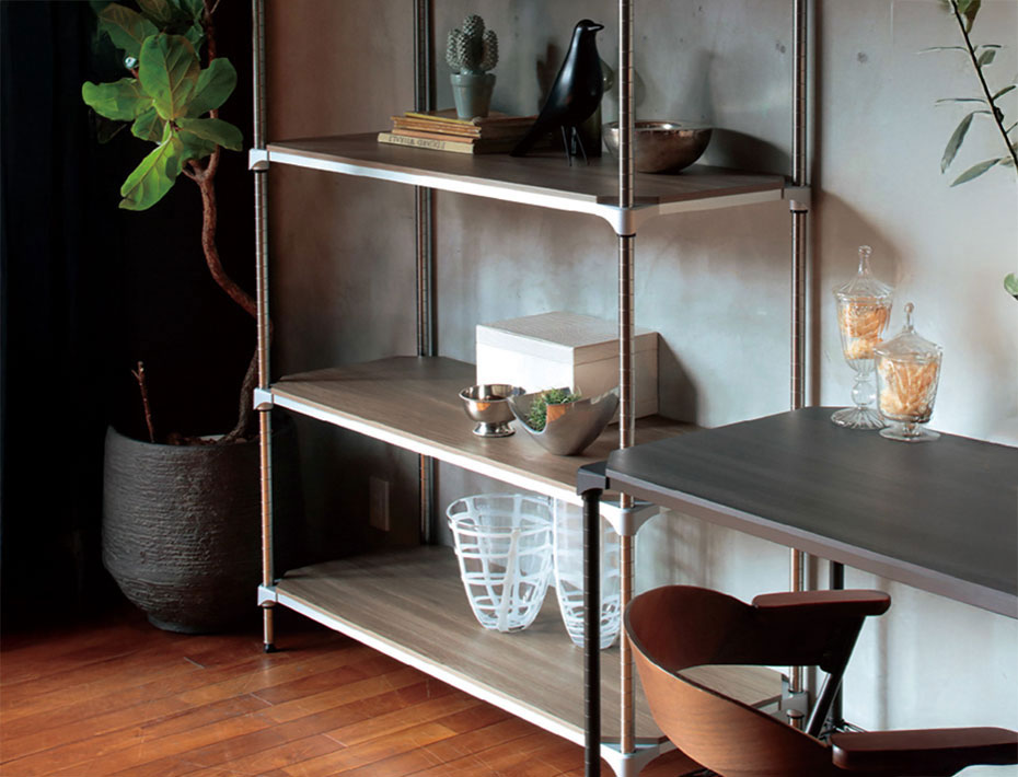 耐久性と美しさを兼ね備えたモダンシェルフ。フレームはアルミ、天板はホルムアルデヒドの放散量の少ないF★★★★仕様。ポールの色に合わせられるように、フレームは3色をご用意。